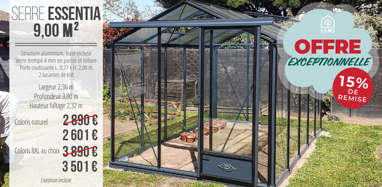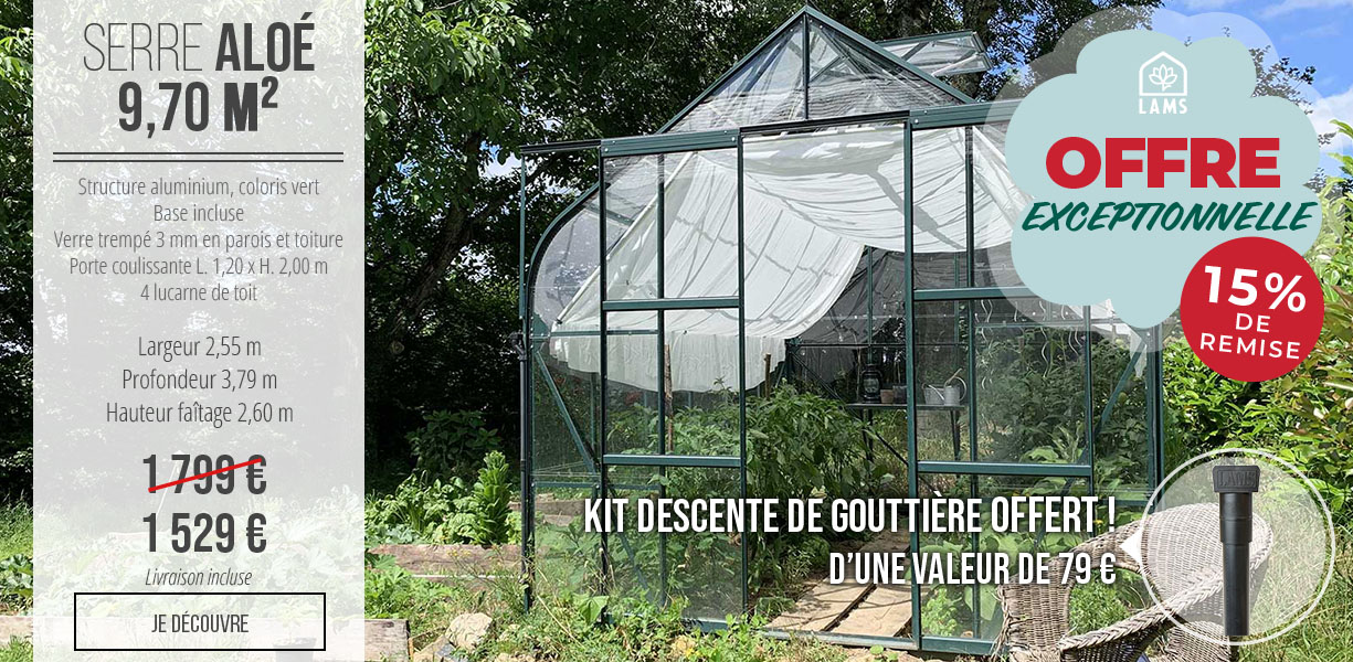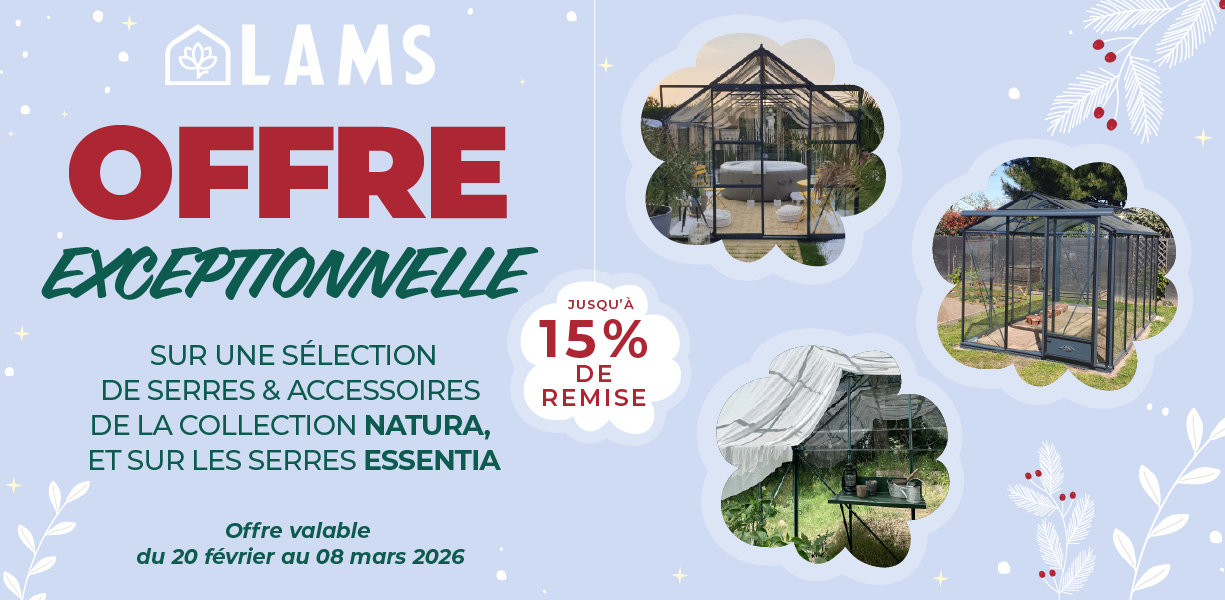 Serres LAMS imagine des serres de qualité qui correspondent aux goûts de chaque amoureux du jardin. Les collections Natura, Azura et à l’ancienne garantissent des serres pour tous les budgets – à partir de 369 € TTC livraison incluse – et tous les styles. Peintes aux couleurs souhaitées, sur chape, sur plot ou en pleine terre, pour des superficies allant de 0,90 m² à plus de 100 m² : Serres LAMS est le seul fabricant français à proposer une gamme aussi complète. Et pour toujours plus de personnalisation, de nombreuses options et accessoires sont proposés.