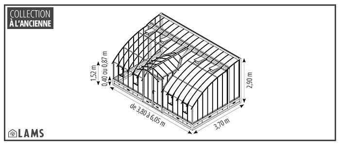LAMS, fabricant spécialiste de la serre et du jardin d´hiver depuis plus de 30 ans, met son savoir-faire à votre service : trouvez la serre qui vous convient dans notre large collection de serres de qualité conçues et fabriquées dans nos ateliers en Vendée. Tout à la fois une serre de culture, un abri pour vos plantes et un charmant jardin d'hiver tout en transparence, la serre à l'ancienne MONTESQUIEU de largeur 3,70 m LAMS vous invite à cultiver la douceur de vivre. Pour votre serre, nous avons sélectionné des matériaux de qualité :