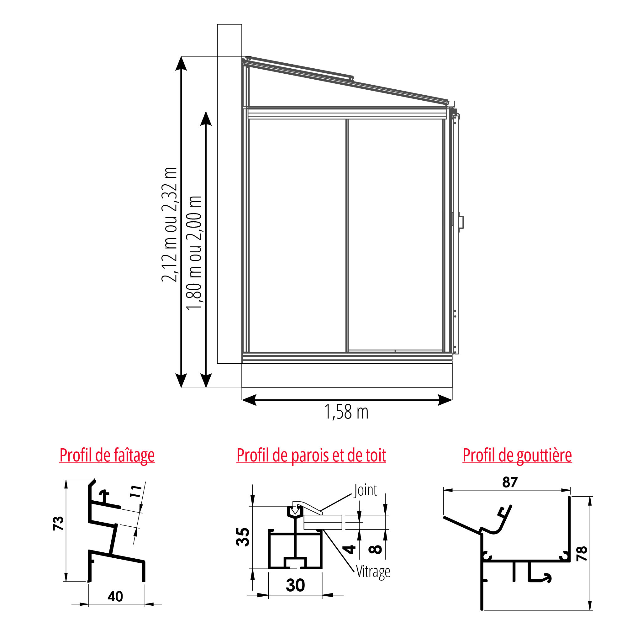 Dimensions de la serre de jardin LUXIA adossée avec une largeur de 1,58 m