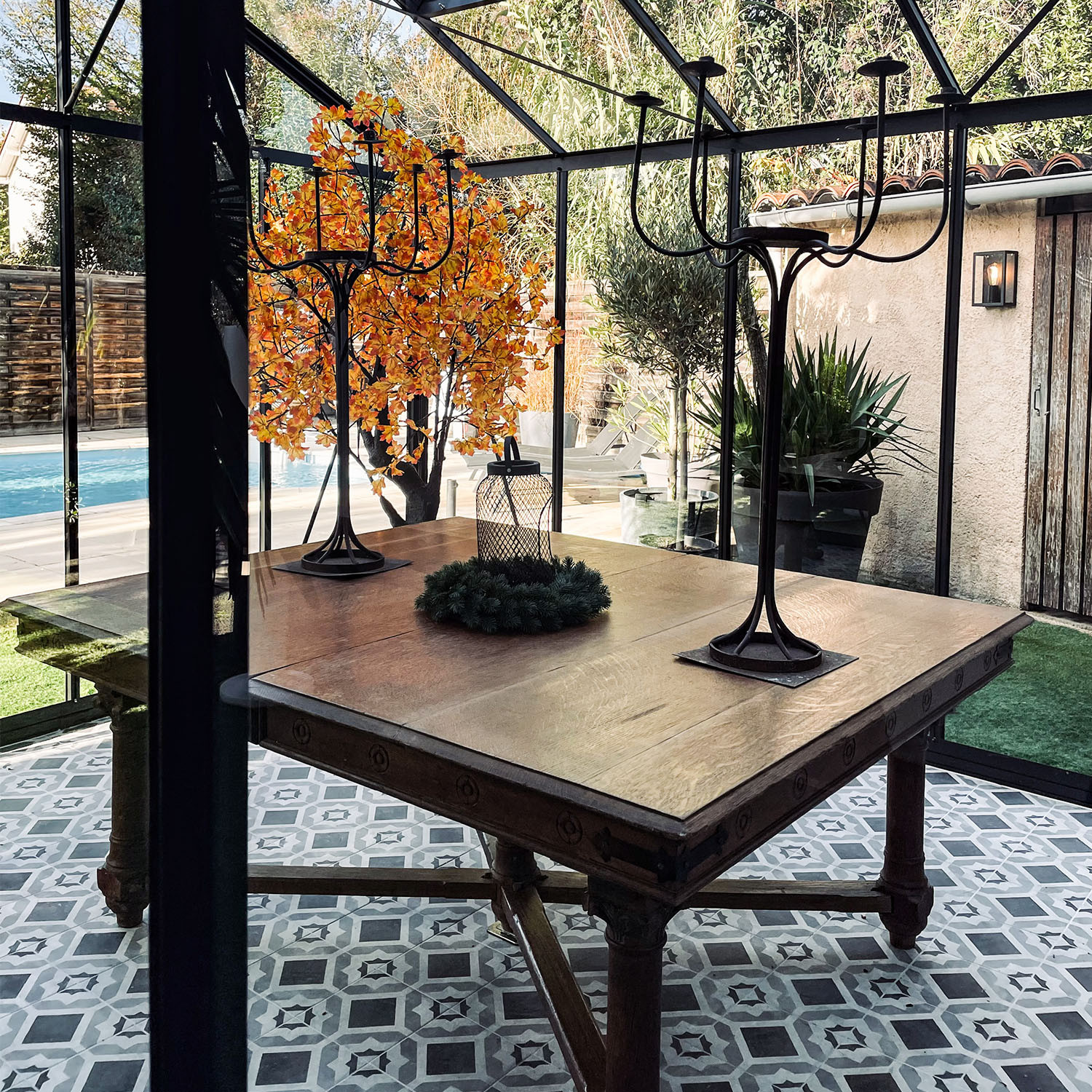 Les moulures décoratives sur la porte sont en fonderie d'aluminium et laquées à la couleur de la serre.
