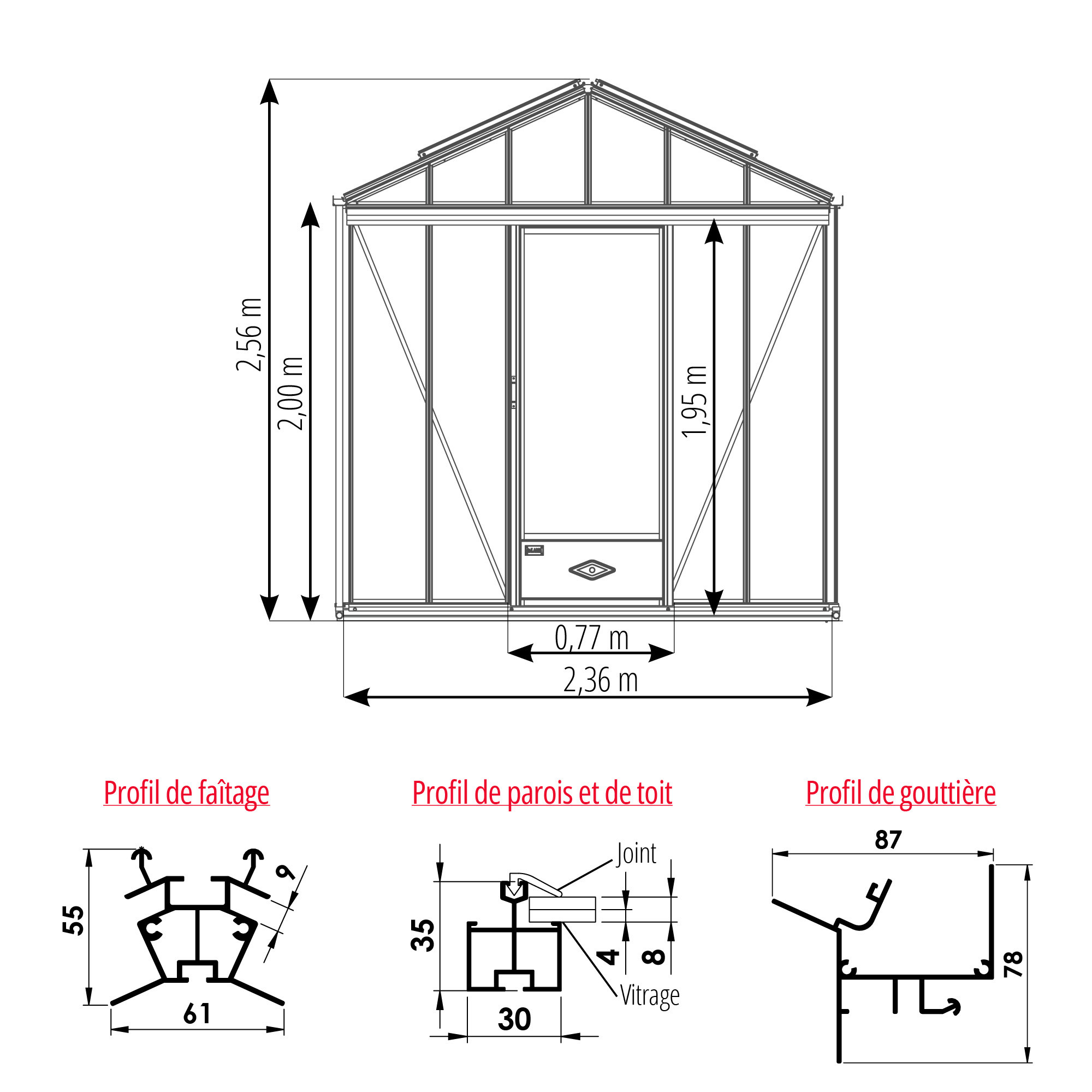 | Base | Incluse, hauteur 10 cm - En aluminium et laquée à la couleur de la serre |