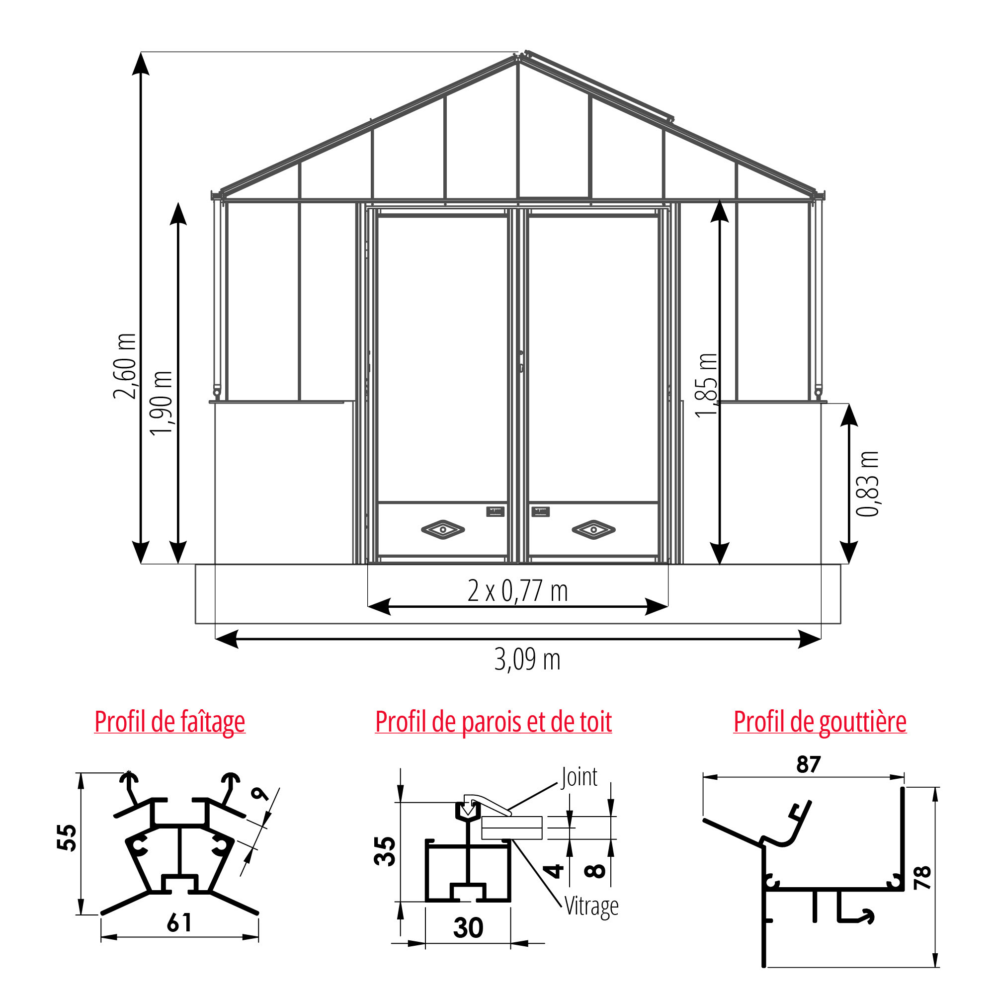 Dimensions de la serre de jardin LUXIA Rétro sur muret avec une façade de 3,09 m