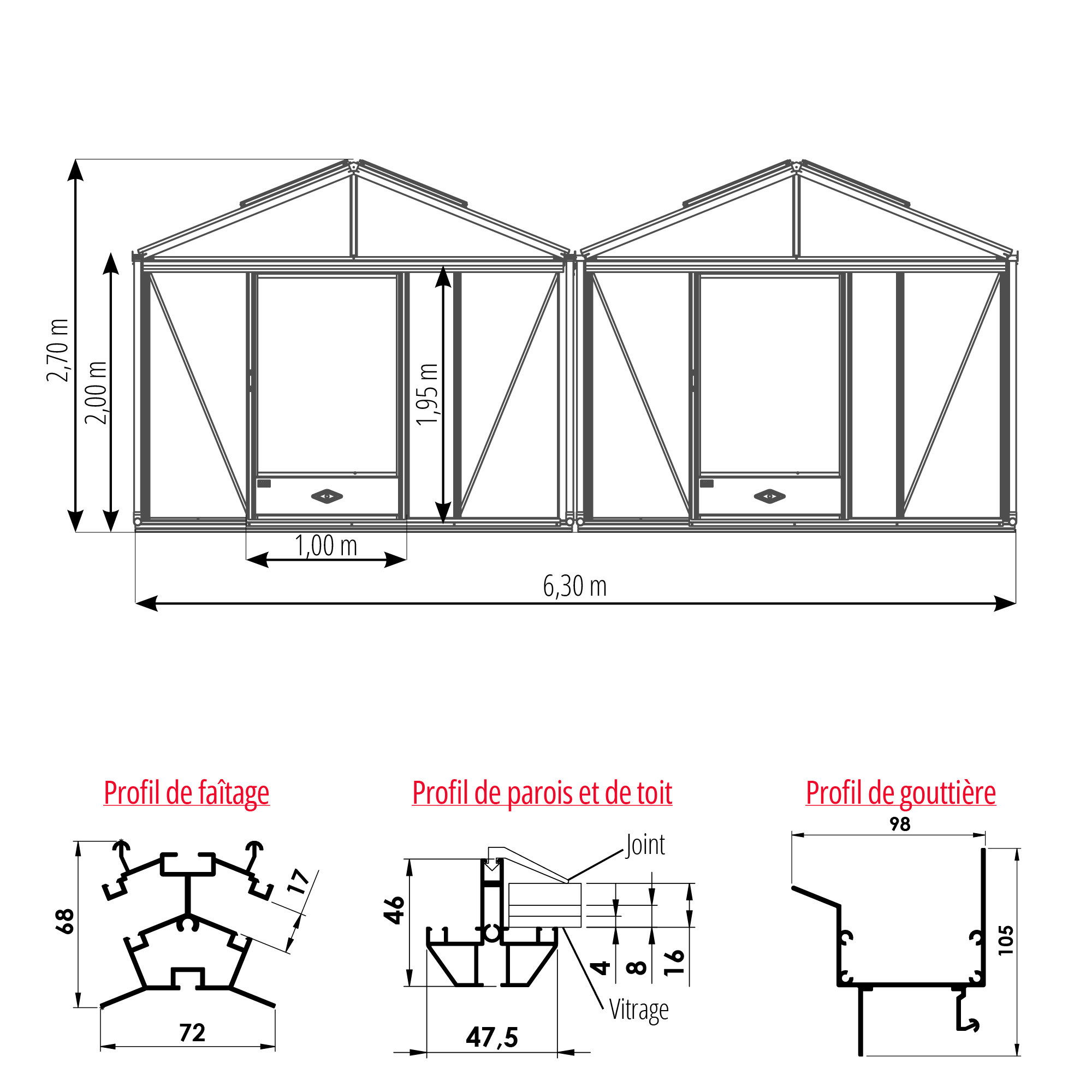 | Descente de gouttière | Incluse, 2 descentes de Ø 50 mm - En aluminium et laqué à la couleur de la serre |