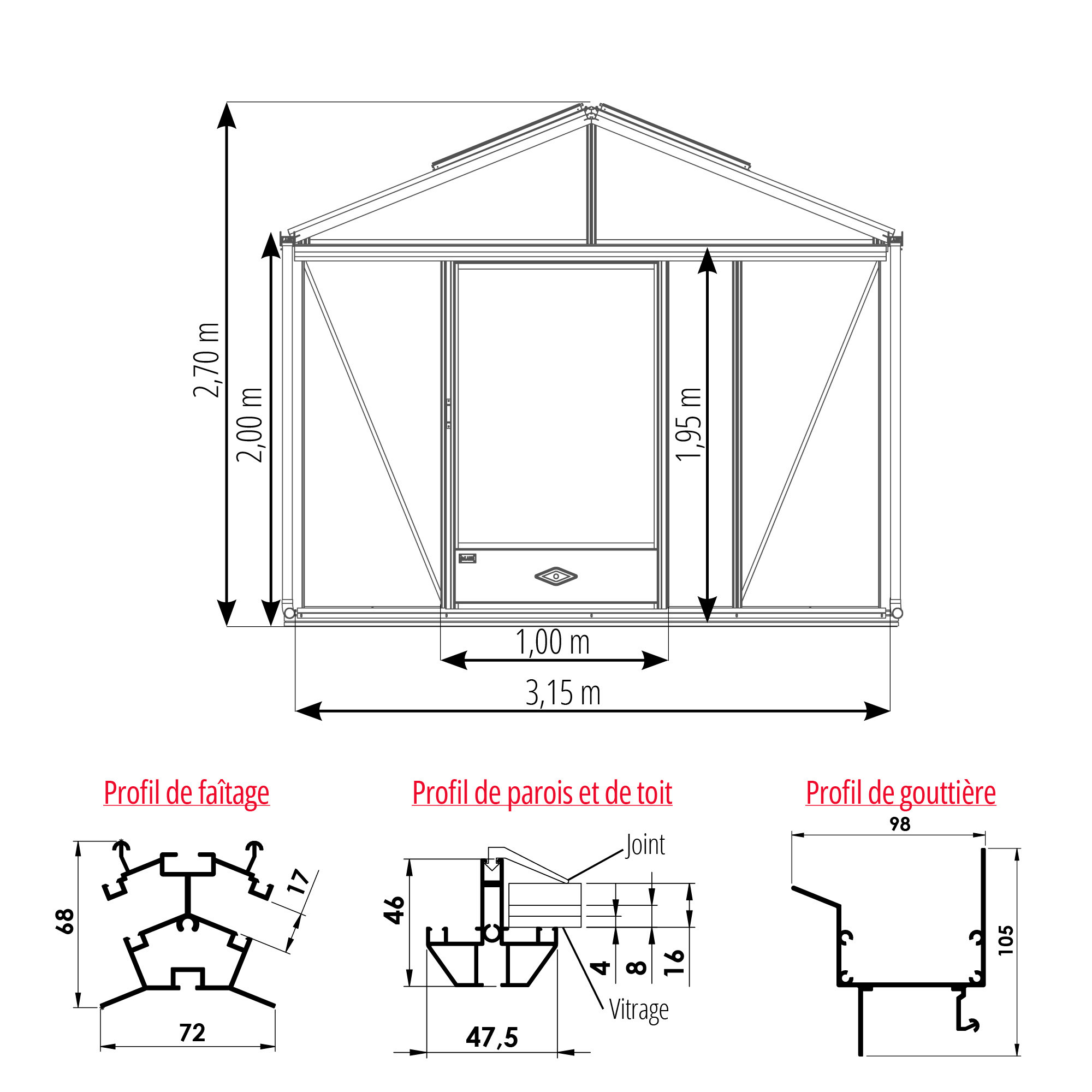 Dimensions de la serre de jardin SUPRA avec une façade de 3,15 m