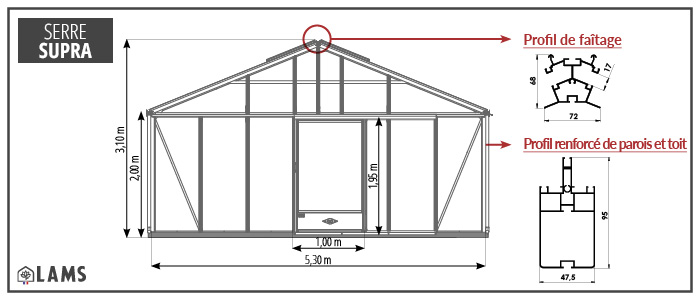 Dimensions de la serre de jardin SUPRA avec une façade de 5,30 m