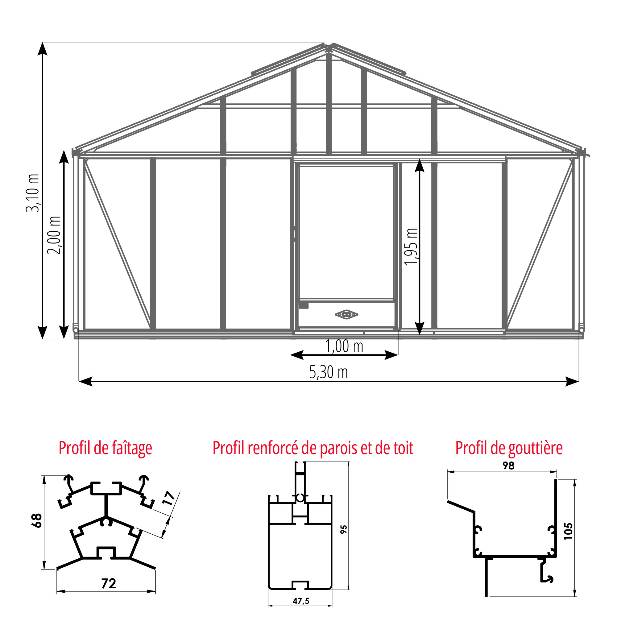 Compte tenu de sa largeur de 5,30 m et de sa hauteur au faîtage de 3,10 m, ce modèle intègre des renforts structurels spécifiquement adaptés à ses dimensions, afin d’assurer la stabilité de l’ensemble.
