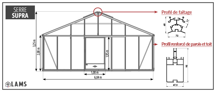 Dimensions de la serre de jardin SUPRA avec une façade de 6,04 m