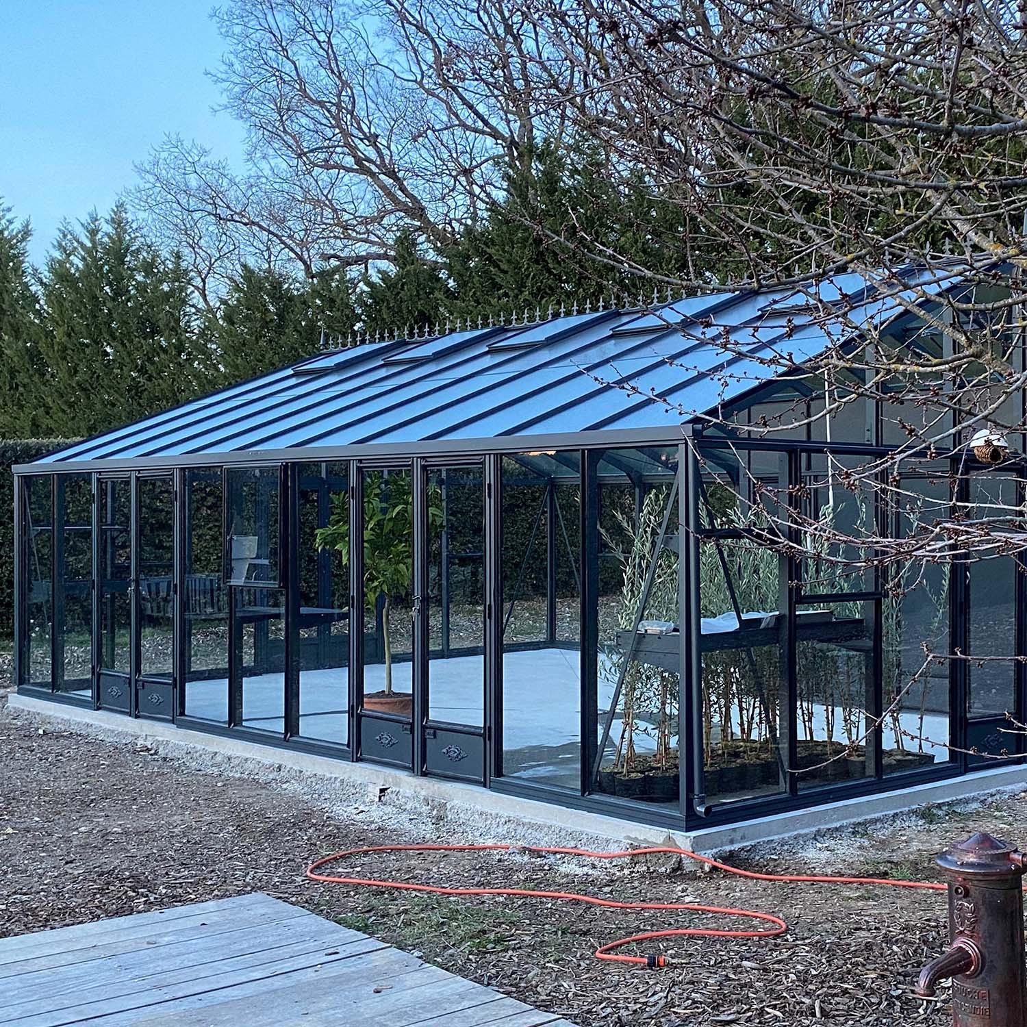 Avec une façade de 6,04 m, la serre en verre trempé et aluminium SUPRA est disponible en 6 longueurs de 4,57 m à 8,30 m.